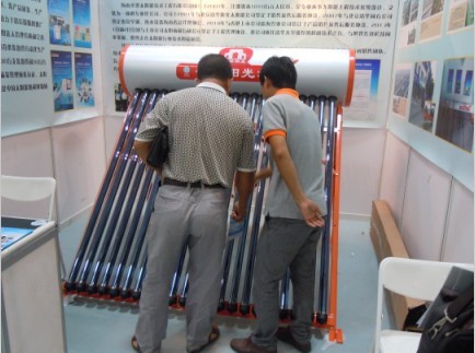 我司員工給客戶介紹清華陽光太陽能熱水器