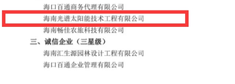 2020年6月11日,海南光譜太陽(yáng)能技術(shù)工程有限公司,榮獲海南省“四星級(jí)誠(chéng)信先進(jìn)企業(yè)”榮譽(yù)稱號(hào)。