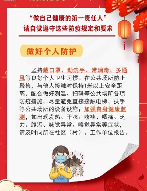 在春節假期期間,要堅持不聚集、不扎堆、不串門,非必要不出島;提倡使用視頻、電話等非接觸方式拜年,如有需求出島或前往高風險地區的人員,必須在上班前提前報備給公司及向公司進行請假,并嚴格遵守前往區域的防疫管理要求,主動配合做好測溫、驗碼、登記、查驗核酸檢測證明等出入防疫措施;如出現發熱、干咳、咳痰、咽痛、乏力、腹瀉等癥狀,請及時向所在社區及公司報告。